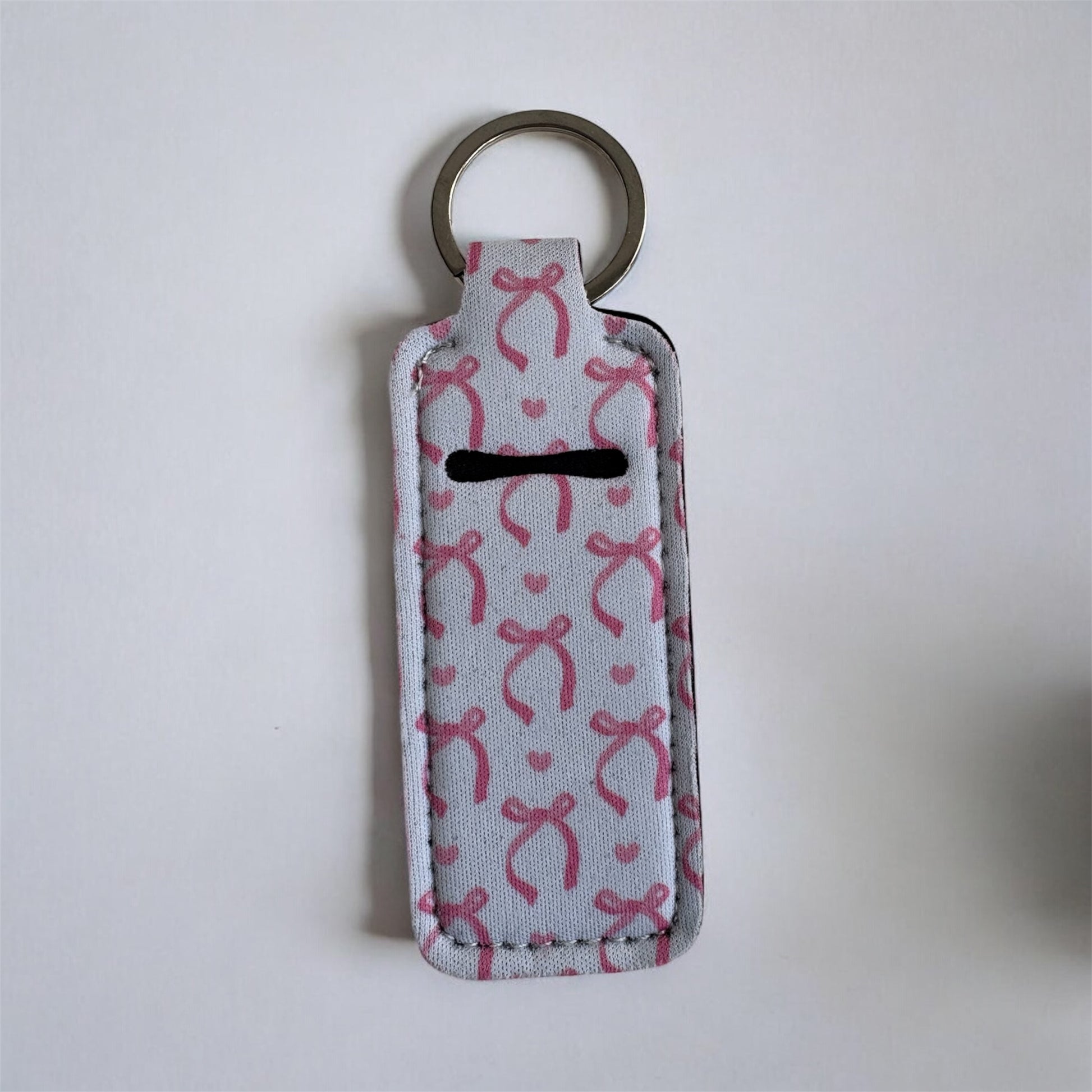 These fabric lip balm keychains feature a playful pink-and-white bow and cherry pattern that’s equal parts fun and functional. Designed to hold your favorite Smooch lip balm, they easily clip onto keys, bags, backpacks, or pouches so soft lips are always within reach.
