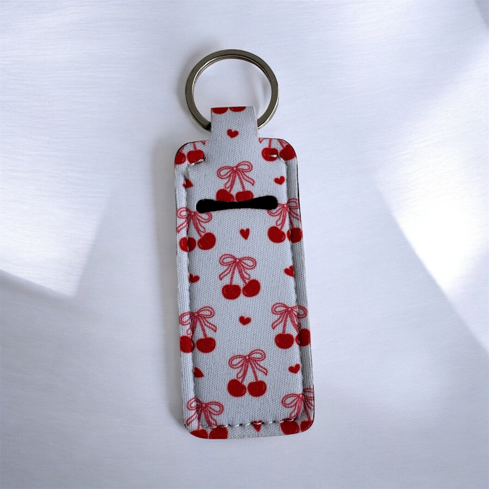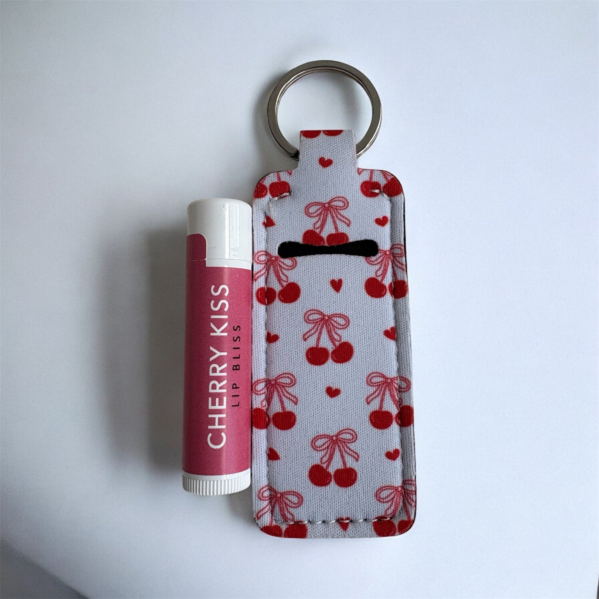 These fabric lip balm keychains feature a playful pink-and-white bow and cherry pattern that’s equal parts fun and functional. Designed to hold your favorite Smooch lip balm, they easily clip onto keys, bags, backpacks, or pouches so soft lips are always within reach.