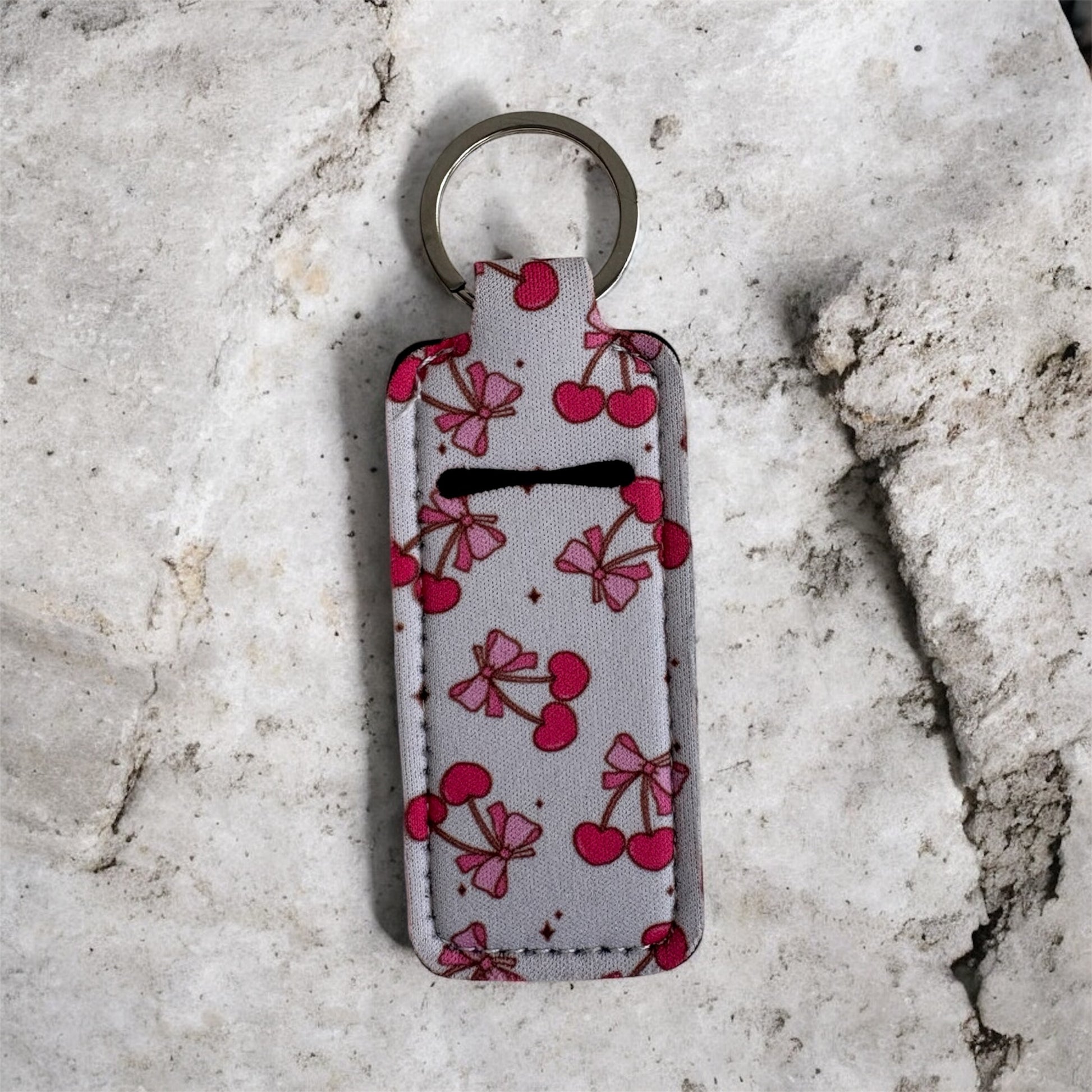 These fabric lip balm keychains feature a playful pink-and-white bow and cherry pattern that’s equal parts fun and functional. Designed to hold your favorite Smooch lip balm, they easily clip onto keys, bags, backpacks, or pouches so soft lips are always within reach.